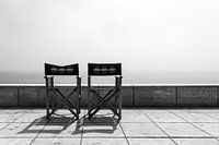 Eenzaam wachtend op dorstige bezoekers , twee stoeltjes op de promenade van Belém , Lissabon . September 2020