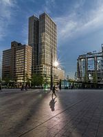 De zon als een ster in de ruit vangt iemand die op weg is naar de trein in Rotterdam
