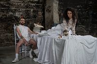 Extravagant, stylish, filmstill, dreamy, fashion, sprookje, storytelling, surrealisme, dieren, diner, bruidsdiner, bruid, bruidegom.