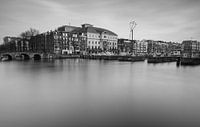 Zwartwit opname van theater Carré aan de rivier de Amstel.
