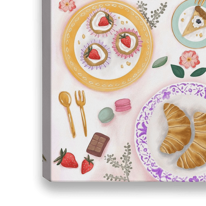 Een heerlijke flatlay van een High Tea tafel, met taart, cupcakes, croissants, macarons, citroen, aardbeien en thee.