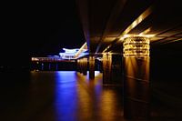 Atmosferisch perspectief 's nachts onder de pier naar het Japanse theehuis.