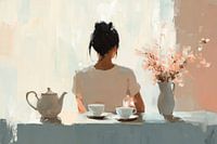 Een rustig moment van bezinning wordt gecreëerd tegen een zachte, pastelkleurige achtergrond. Een vrouw met opgestoken haar kijkt peinzend naar de gedekte tafel, die is versierd met fijn porselein en delicate bloemen. De delicate stoom van de thee vermengt zich met de kalme sfeer, terwijl de zon zachtjes door het raam schijnt.