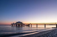 Zonsopgang op Timmendorfer strand Oostzeekust. Je waant je in het Verre Oosten als je het exotisch uitziende theehuis in Japanse stijl aan het eind van de pier ziet.
