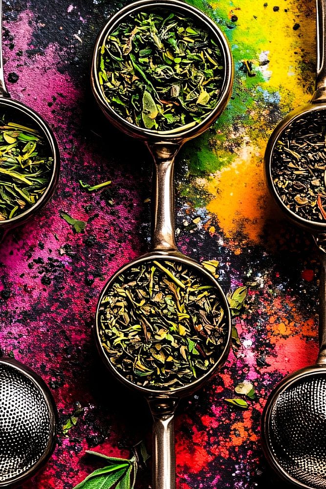 Dit kleurrijke ontwerp toont een levendige opstelling van zilveren theezeefjes gevuld met verschillende soorten thee en kruiden. Tegen een achtergrond van spetterende, felle kleuren zoals roze, geel, groen en oranje ontstaat een speels en dynamisch kunstwerk. De mix van kleur en detail maakt dit ontwerp perfect als decoratief stuk in een moderne keuken of woonkamer. Het is een inspirerende afbeelding die een warme, creatieve sfeer toevoegt aan elke ruimte.