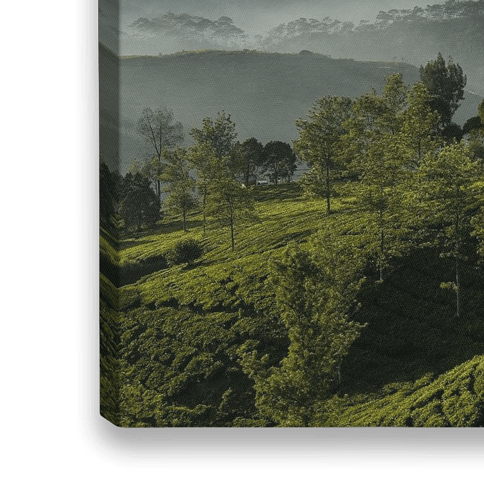Landschapsfoto van een thee plantage in Java, Indonesië. Zonsopkomst in Cukul, uitkijkpunt. groene heuvels met bergen en wolken op de achtergrond.