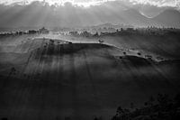 Zwart wit landschapsfoto van heuvels met thee plantages en bomen. De zonnestralen door de mist en wolken, over de heuvels van een theeplantage in Java, geven een sprookjesachtig effect. Op de achtergrond zijn bergen zichtbaar.
