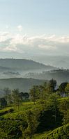 Deel 1 van een drieluik landschapsfoto van een theeplantage in Java, Indonesië. Zonsopkomst in Cukul, uitkijkpunt. Groene heuvels met bergen en wolken op de achtergrond.