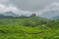 Bomen in theeplantage in Kerala, nabij Munnar, Zuid-India tijdens het regenseizoen met mist en regenwolken