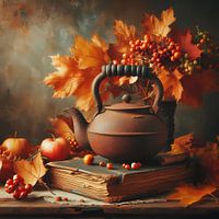A rustic teapot sits atop a stack of old books, surrounded by vibrant autumn leaves and clusters of berries. Warm tones and soft lighting create a cozy, nostalgic atmosphere.