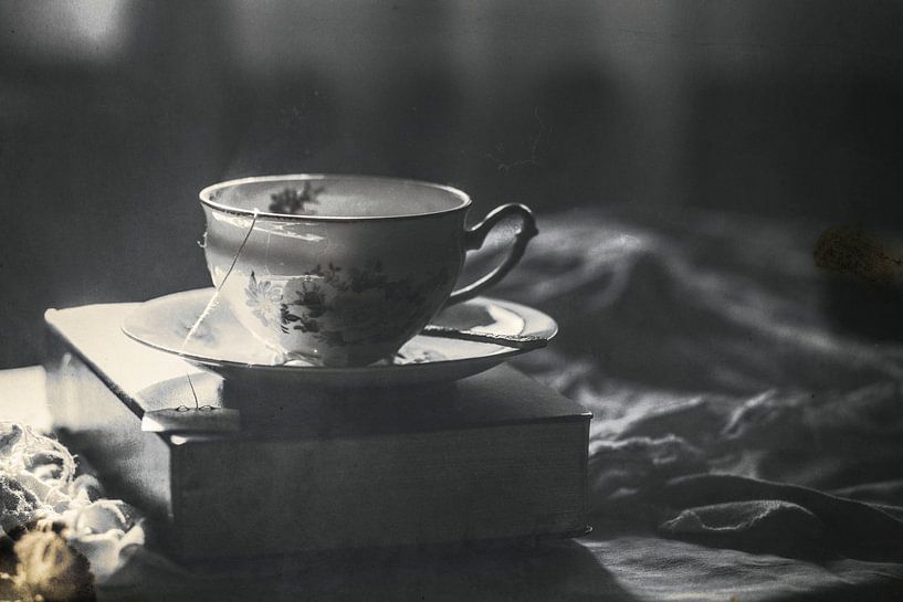 Tijd voor een kopje thee: een zacht licht valt in de kamer. Een kopje thee staat op een boek, alsof de theedrinker even wil pauzeren, van de thee wil genieten en de dag wil wegdromen. Het licht creëert een sterk contrast tussen licht en donker in het tegenlicht. Het beeld is gedesaturiseerd, bijna zwart-wit, de blik valt op het kopje…