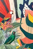 Een collage van moderne straatkunst met vintage afbeeldingen van tropische papegaaien. Een onverwachte, kleurrijke, combinatie die wonderwel goed uitpakt.