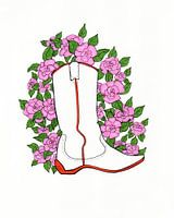 De afbeelding toont cowboylaars met een achtergrond van roze rozen. Zelf heb ik een paar cowboylaarzen met een gestileerd patroon van witte rozen, maar in dit geval heb ik de bloemen roze gemaakt, ze buiten de laars geplaatst en ze een suggestie van echtheid gegeven.