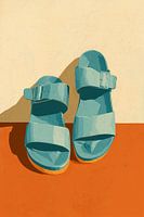 Een minimalistisch kunstwerk van twee turquoise sandalen, gestileerd weergegeven tegen een warme terracotta ondergrond en crèmekleurige achtergrond. De compositie speelt met schaduwwerking en geometrische vormen, waarbij de sandalen een moderne, bijna architecturale uitstraling krijgen door de strakke lijnen en vlakverdeling.