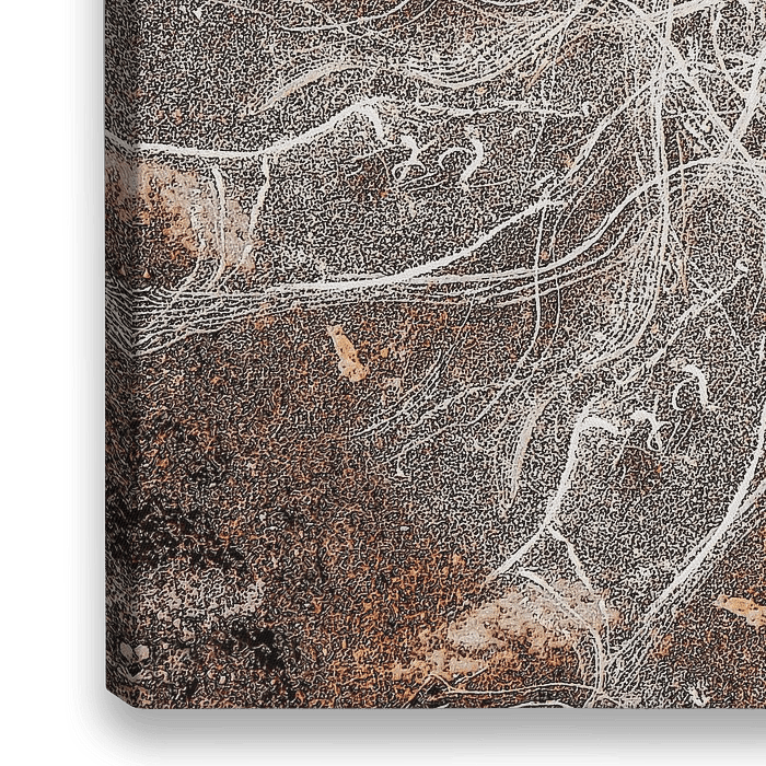 Een abstract caleidoscopisch beeld in bruine en grijze tinten, gebaseerd op een foto van een dun laagje ijs op straattegels