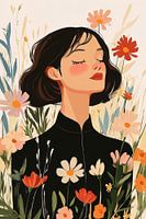 Een gelaatsuitdrukking van geluk en ontspanning, een jonge vrouw met haar ogen gesloten, omringd door kleurrijke bloemen die haar omkaderen. Een gevoel van vrede en harmonie tussen de mens en de natuur wordt overgebracht.