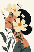 Dit kunstwerk toont een vrouwelijk profiel omringd door prachtige bloemen, zorgvuldig gestileerd in een mix van oranje, zwart en crèmekleurige tinten. Het beeld straalt een gevoel van harmonie en eenheid met de natuur uit, waarbij de vrouwelijke vorm en de bloemen als één geheel samenvloeien in een gracieuze compositie.