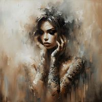 Een krachtig olieverfwerk van een vrouw die diep in gedachten verzonken is, haar blik reflecterend op haar ervaringen. De ruwe penseelstreken en aardse bruintinten geven haar een tijdloze schoonheid, terwijl de tatoeages op haar huid de lagen van haar gedachten en emoties onthullen. Elke lijn en inktafdruk vertelt een verhaal van…