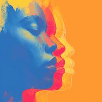 Drie overlappende gezichten in knallende kleuren verbeelden een innerlijke dialoog. Denken, voelen en zijn versmelten in een explosie van oranje, blauw en rood.