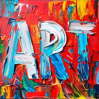Kunstwerk met het woord "Art" geschilderd in grote letters met dikke impasto penseelstreken waardoor ze een driedimensionaal gevoel krijgen. De achtergrond met levendige kleuren voegt extra diepte toe aan het kunstwerk. Dit kunstwerk symboliseert creativiteit en diversiteit.