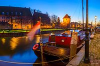 Avondzicht over de Thorbeckegracht in Zwolle tijdens een koude winteravond. Breed panorama met klassieke zeilschepen op de voorgrond.
