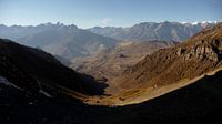 Bovenaan de top van het Annapurna gebergte, Himalaya in Nepal. De pas Thorong La over en terug het dal in.