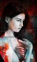 Portret van een bedachtzame vrouw in zwart, wit en rode olieverf. Dankzij de kleurencombinatie leent dit werk zich uitstekend bij een warme inrichting.