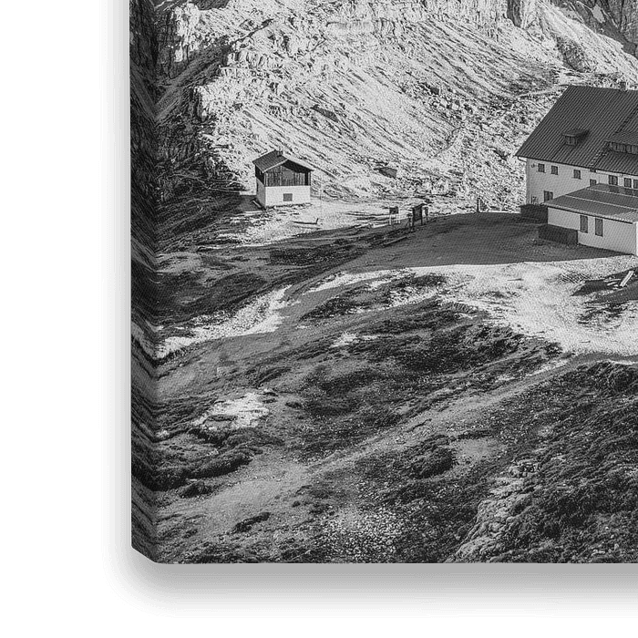Koop dit landschapskunstwerk Three Peaks Hut in de Dolomieten. Zwart-wit foto. van Manfred Voss, Zwart-Wit Fotografie op canvas, aluminium dibond, (ingelijste) fotoprint, behang en ArtFrame, op maat geprint in Fine-Art kwaliteit.
