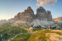 Gezicht op de zuidkant van de Three Peaks met de Auronzo Hut en de tolweg op de voorgrond.
