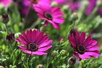 Foto van drie paarse margieten. Deze foto is ideaal voor een tuinposter /tuinposters.