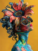 Portret van een bloemenvrouw op een vaas. De bloemenpracht heeft 3 prachtige harten met zaden. De bloemenpracht staat op een gekleide vaas. Een kleurrijk geheel op een zonnige gele achtergrond. Daarnaast is gebruik gemaakt van blauw, rood, roze en groen. Surrealistisch en abstract. Passend bij diverse stijlen waaronder kleurrijk, bloemen, portret, vrouw, abstract modern. Artist: Bianca ter Riet