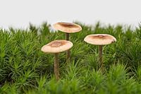 Drie Paddestoelen op een bed van Sterrenmos met een witte achtergrond. De foto is samengesteld uit verschillende beelden om de scherptediepte te vergroten. De beelden zijn softwarematig samengevoegd met Helicon Focus software. Het beeld, wat is opgenomen in de studio is een herfsttafereel met een groene natuurlijke achtergrond en met…