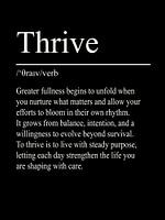 Thrive staat voor persoonlijke groei die voortkomt uit balans, mindfulness en bewuste ontwikkeling. Deze minimalistische typografie poster drukt de betekenis van de term rustig en duidelijk uit.