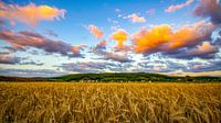 Een warme zonsondergang dompelt het korenveld op de voorgrond onder in gouden licht. De korenaren glanzen in het laatste licht van de dag en geven het tafereel een zachte, bijna tijdloze sfeer. Aan de horizon ligt het dorp – rustig, vertrouwd, genesteld in de uitgestrektheid van het landschap. Daarboven strekt zich een blauwe lucht uit…