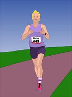 Dit digitale kunstwerk toont een kleurrijke, gestileerde illustratie van een hardloper in actie. De achtergrond bestaat uit een heldere, blauwverlopende lucht die overgaat in een groene horizon, met een paarsachtige weg die diagonaal door het beeld loopt. De loper bevindt zich in het midden van de compositie en draagt een lichtpaarse singlet, donkere hardloopshort en opvallende roze hardloopschoenen met zwarte veters. Op de borst prijkt een startnummer met de naam “Babe” en het nummer 445, gedrukt in zwarte cijfers op een witte achtergrond, omlijst door een rode rand.