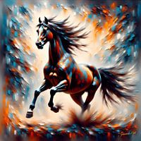 Een krachtig paard is gevangen op het hoogtepunt van de beweging, bevroren in het midden van de galop terwijl zijn manen dramatisch door de lucht stromen. Elk detail van zijn vorm straalt kracht en momentum uit, van de spanning in zijn spieren tot de zelfverzekerde verlenging van zijn pas. Het paard lijkt niet te stoppen en belichaamt…