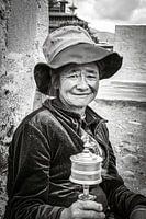 Tibetaanse vrouw met draaiende gebedsmolen, portret.