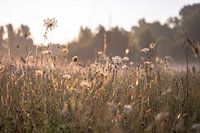 Landschap met zicht op de begroeiing van natuurgebied Tichelgaten in Buren, op de betuwe in Gelderland, waar de opkomende zon een gouden gloed werpt over de wildgroei, en met de nevel op de achtergrond.