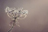 close up van een Daucus carota, ofwel wilde peen, helemaal bedekt met dauwdruppeltjes, die glinsteren in het licht van de opkomende zon.