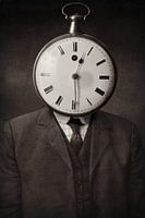 Vintage, surrealistische afbeelding in zwart wit met een vleug sepia. Man met zakhorloge. Of zakhorloge met man, het is maar net hoe u het bekijkt. Het grappige van dit werk is dat het horloge 2 maal per etmaal gelijk loopt aan uw eigen horloge, en dit alles zónder batterijen!