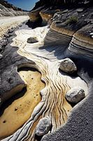 "Timelines in Stone" toont de rauwe schoonheid van geërodeerde rotsformaties waar de natuur ingewikkelde, gelaagde patronen in de aarde heeft gebeiteld. Grote, verspreide stenen omzomen een grillig pad en creëren een visueel boeiende scène van geologische geschiedenis. Warme aardetinten - bruin, oker en zacht grijs - contrasteren prachtig met het licht dat over het oppervlak strijkt, waardoor de texturen en oude patronen die door de tijd zijn geëtst, worden benadrukt. Dit kunstwerk is ideaal voor liefhebbers van natuurlijke landschappen, geologie en rustieke esthetiek, en brengt de rustgevende kracht van het buitenleven in je interieur.