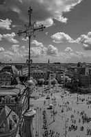 Deze zwart-wit foto toont een adembenemend uitzicht op de Dam in Amsterdam op een zonnige dag, met het Nationaal Monument prominent in beeld. Op de voorgrond zien we een sierlijke metalen spits of windwijzer, gedecoreerd met fleur-de-lis-achtige vormen en een vergulde bol. Het geheel zweeft als het ware boven het plein en geeft het…