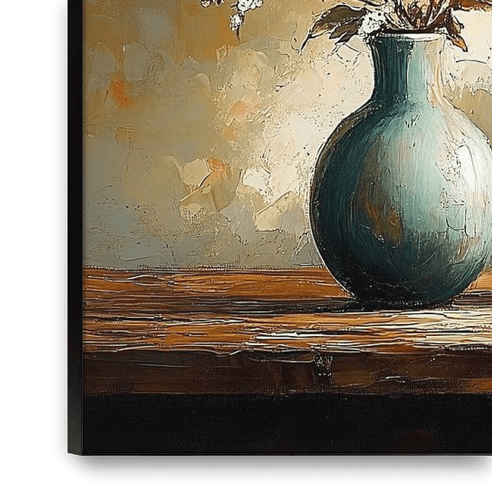 Dit kunstwerk ademt een serene elegantie uit, waarbij de delicate witte bloesems een prachtig contrast vormen met de robuuste turquoise vazen. De zachte, warme lichtinval creëert een etherische sfeer, terwijl de textuurrijke penseelstreken diepte en leven toevoegen aan de compositie. De subtiele balans tussen de organische vormen van de…