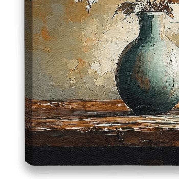 Dit kunstwerk ademt een serene elegantie uit, waarbij de delicate witte bloesems een prachtig contrast vormen met de robuuste turquoise vazen. De zachte, warme lichtinval creëert een etherische sfeer, terwijl de textuurrijke penseelstreken diepte en leven toevoegen aan de compositie. De subtiele balans tussen de organische vormen van de…