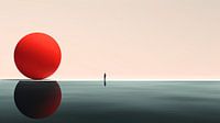 Het kunstwerk presenteert een minimalistisch, bijna surrealistisch beeld waarin een gigantische rode cirkel het visuele middelpunt vormt.