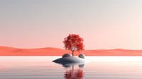 Het toont een enkele rode boom op een klein eiland dat omringd wordt door het kalme water van een meer of een rustige zee. De boom is weerspiegeld in het water, wat zorgt voor een perfect symmetrische afbeelding die bijdraagt aan het serene gevoel van het kunstwerk. De achtergrond bestaat uit zachte, rozeachtige duinen die een subtiele, rustgevende sfeer creëren en bijdragen aan het gevoel van isolatie en rust. Het licht lijkt van een ondergaande zon te komen, wat het beeld een warme gloed geeft en de rode kleur van de boom nog meer laat opvallen.