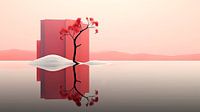 Centraal staat een delicate boom met rode bladeren die scherp afsteken tegen een achtergrond van geometrische blokken in verschillende tinten roze. Deze blokken lijken de deuren te openen naar een verstilde wereld waar de tijd stilstaat. Een zacht glooiend landschap en de ondergaande zon worden weerspiegeld in het rimpelloze water, wat bijdraagt aan het spiegelende effect en de symmetrie van het tafereel. De aanwezigheid van een vogel in vlucht voegt een dynamisch element toe aan de verder stille en meditatieve sfeer. De subtiele zandduinen in de verte en de zachte tinten van de lucht suggereren een einde van de dag en een moment van introspectie.