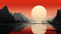 Dit minimalistische kunstwerk, met zijn gelaagde bergen en reflecterend water, nodigt de kijker uit tot rust en reflectie.