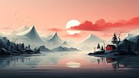 Het middelpunt is een klein, eenzaam huisje met een opvallend rood dak, gelegen aan de rand van een kalme, uitgestrekte watermassa. De reflectie van het huisje en de bomen creëert een symmetrische harmonie die rust uitstraalt.