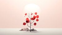 Dit kunstwerk vertegenwoordigt de essentie van minimalistische schoonheid. Centraal staat een gestileerde boom met rode bladeren die contrasteren tegen een zachte, rosékleurige achtergrond.